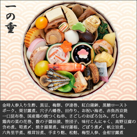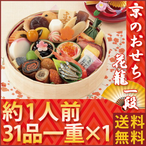 商品詳細情報 名称 京菜味のむら おせち花籠 (一段二組) 内容量 一段二組(一組あたり計31品) 黒豆 25g 梅餅 1個 金時人参入り生酢 25g いくら 3g 鮭昆布なると巻 1切 穴子八幡巻 1切 合鴨つくね串 1本 松笠いか 1個 さごしのおぼろ包み 1個 赤魚西京焼 1切 お祝い海老 1尾 紅白蒲鉾 1切 伊達巻 1切 笹団子 1個 だし巻 1切 黒糖ローストポーク 1切 数の子 1切 黄金にしん 1切 田作り 6g 栗甘露煮 1個 黒豆がんも含め煮 1個 六角里芋煮 1個 手綱こんにゃく 1個 寿高野含め煮 1個 椎茸旨煮 1個 ごぼう煮〆 1個 筍煮〆 1個 松麩 1個 梅型人参 1個 若桃甘露煮 1個 金柑甘露煮 1個 サイズ 約径216mm×高さ55mm 約2人前(一段二組) 特製紙重箱 原材料 コチラから 保存方法 解凍方法 賞味期限 冷凍保存 冷蔵庫(10℃以下)で17時間解凍 2020年1月31日(冷凍状態で) 製造業者 株式会社ノムラフーズ〒612‐8394 京都市伏見区下鳥羽西芹川町66 ご確認事項 ※解凍後は冷蔵庫で保存の上、なるべく早くお召し上がり下さい。