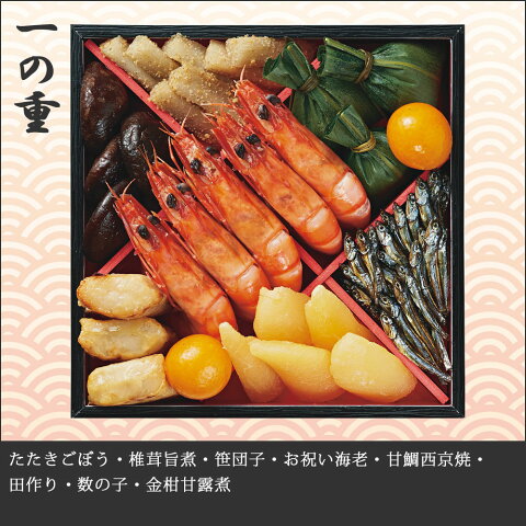 商品詳細情報 名称 京菜味のむら おせち千都 内容量 四段計41品 <一の重> 赤魚の南蛮漬 45g 椎茸旨煮 4個 笹団子 3個 お祝い海老 5尾 田作り 25g 黒豆 55g 数の子 45g 金柑甘露煮 2個 梅羊羹松葉串 1本 <二の重> ミートローフのパイ包み 3切 サラミチーズ巻 3切 リンゴと豆腐のパイ包み 3切 スモークチキンのマリネ 45g スモークサーモントラウト 1個 ビーンズとトマトのバジルサラダ 50g グリーントマトピクルス 4個 豚角煮 5切 磯黄金 35g ブラックオリーブ 3個 <三の重> 伊達巻 3切 一口昆布巻 5個 紅白蒲鉾 4切 パストラミポーク 35g いくら 30g パーナ貝オイル漬 3個 アンチョビオリーブ 3個 すぐき入りキャロットラペ 50g チーズ入りレーズンナッツ 40g 胡麻甘藷 40g <四の重> 寿高野含め煮 2個 手綱こんにゃく 3個 筍煮〆 3個 帆立旨煮 3個 鱈旨煮 55g ペッパービーフ 35g 金時人参入り生酢 50g たたきごぼう 40g 栗甘露煮 4個 甘鯛西京焼 2切 梅型人参 2個 松麩 2個 サイズ 約172mm×172mm×高さ46mm 約4-5人前(四段) 特製紙重箱 原材料 コチラから 保存方法 解凍方法 賞味期限 冷凍保存 冷蔵庫(10℃以下)で17時間解凍 2020年1月31日(冷凍状態で) 製造業者 株式会社ノムラフーズ〒612‐8394 京都市伏見区下鳥羽西芹川町66 ご確認事項 ※解凍後は冷蔵庫で保存の上、なるべく早くお召し上がり下さい。